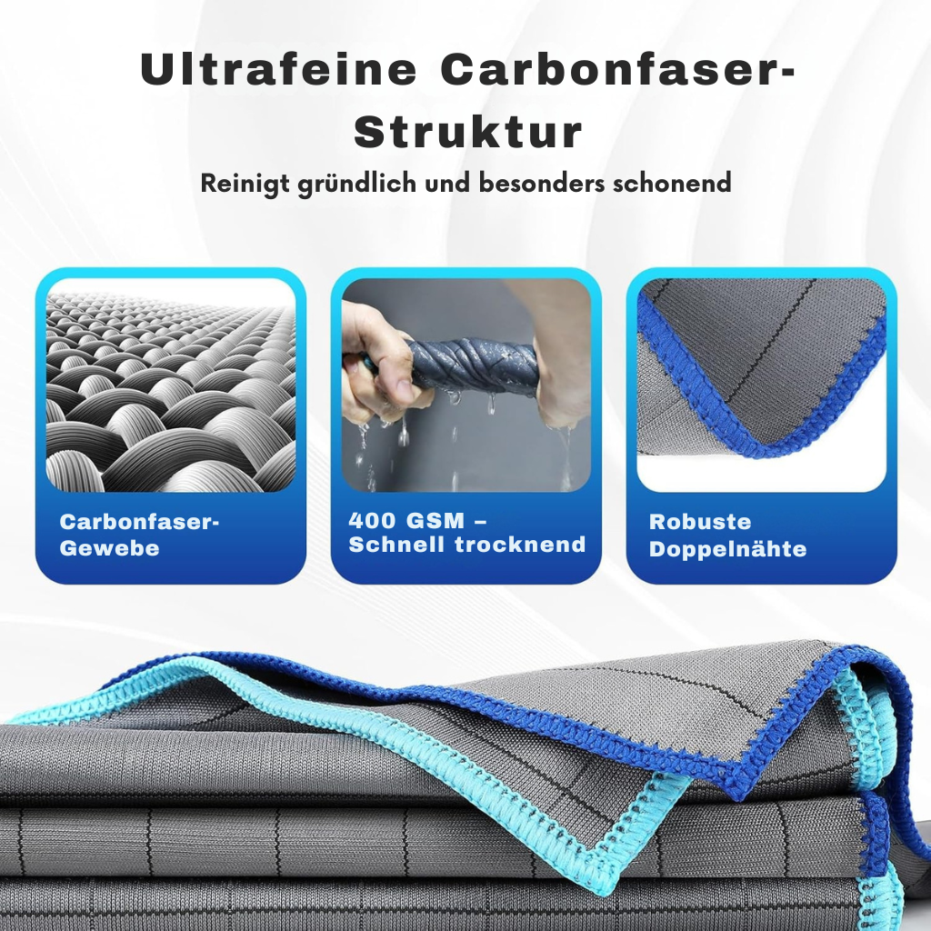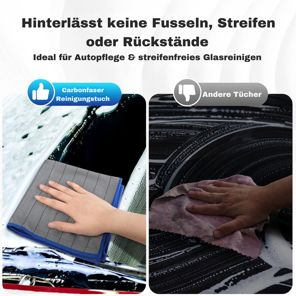 Besonders bei der Autopflege zeigt sich der Unterschied – perfekter Glanz auf Scheiben, Lack und Chrom dank modernster Carbonfasern. Kein Vergleich zu billigen Mikrofaser-Alternativen.